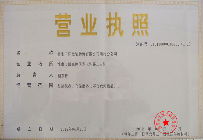 衡水广怀运输物流有限公司淮南分公司营业执照(正本)